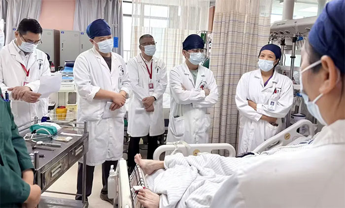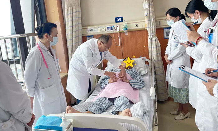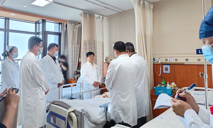 随后,在席教授的带领下,科室团队来到患者病床旁,认真听取管床医师介绍患者病情。在主治医师进行补充汇报后,席刚明教授俯下身,一边轻声询问患者,一边仔细核对病历资料。