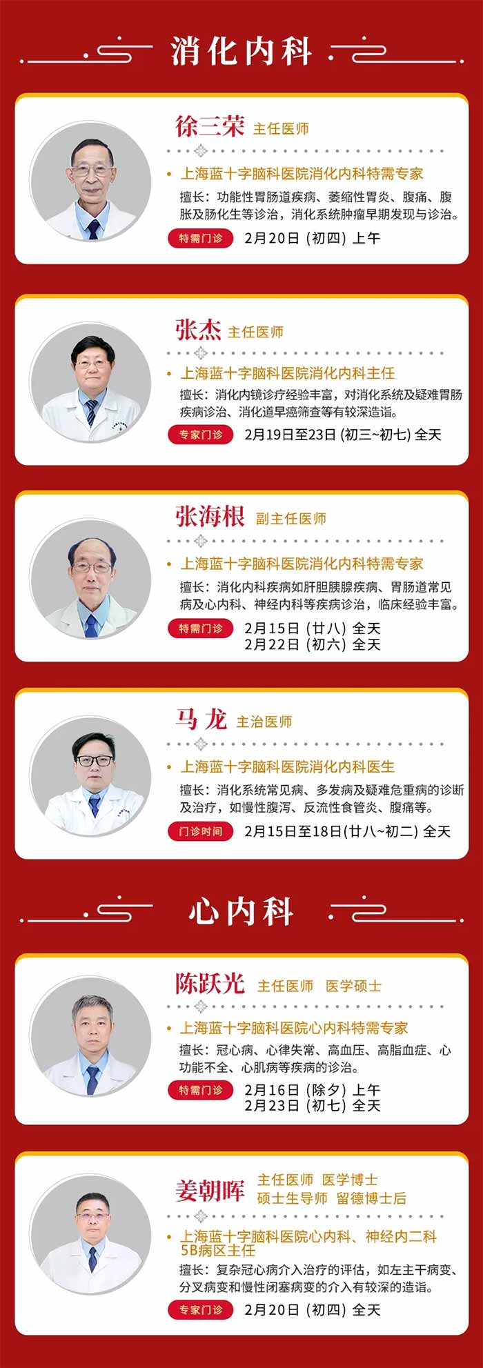 无论何时,您的健康都是我们最深的牵挂!为节约您的宝贵时间,减少等候,建议您提前通过上海蓝十字脑科医院微信公众号在线预约,或拨打暖心服务热线 021-64879999进行咨询与挂号。提前规划,错峰就诊,让关爱更高效,让团圆更安心。(注:以上门诊信息仅供参考,请以实际出诊情况为准)