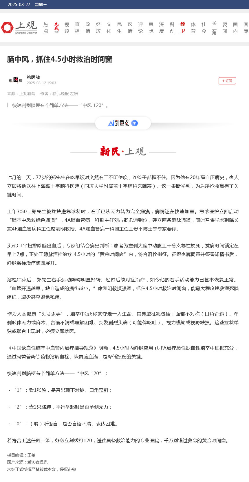 上观新闻 | 脑中风,抓住4.5小时救治时间窗