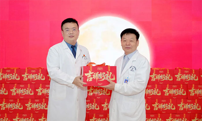 书记朱敏和院长项耀钧等院领导心系职工,来到门诊大厅与大家亲切交谈,逐一将象征着“团圆美满”的月饼礼盒送到各科室员工代表手中,致以节日的诚挚问候。每一份礼盒都满载着医院的深切关怀与诚挚祝福,让大家感受到了节日的喜悦,更体会到了“蓝十字”大家庭的温暖。
