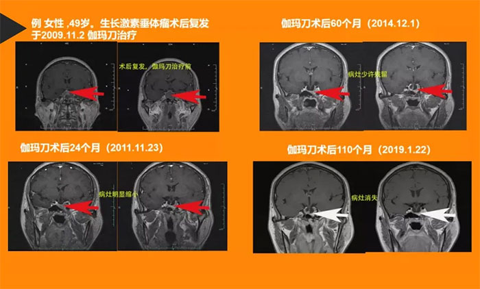 一项单中心单次伽玛刀SRS治疗垂体生长激素腺瘤的回顾性研究显示,57%(58/102)的肢大患者在中位时间19个月内达到生化缓解。黄润生副主任曾长期追踪一位垂体生长激素腺瘤术后残留再行伽玛刀治疗后患者的病情变化。