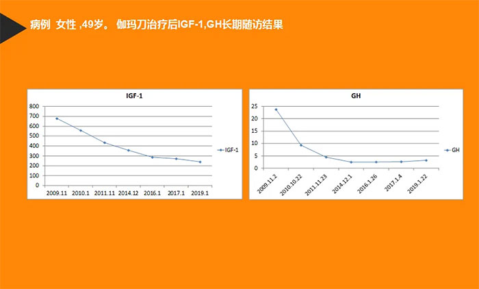 ▲经伽玛刀治疗,患者GH值和IGF-1值逐渐下降到正常范围