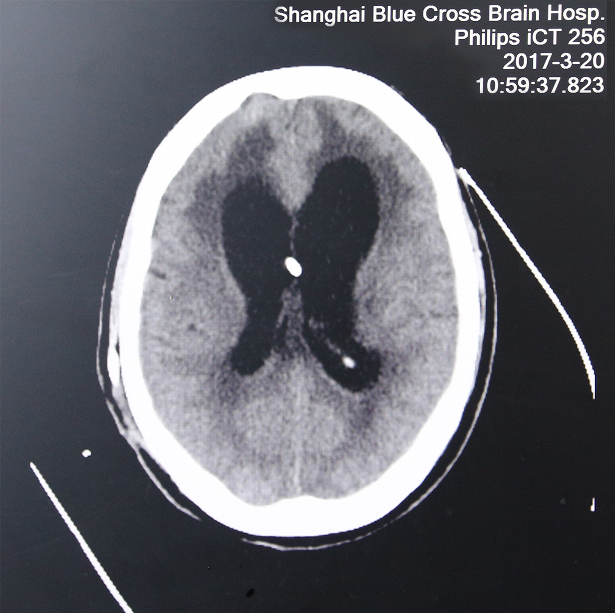 最近头颅CT影像:脑沟回明显,脑室缩小,脑压降低,重新置管分流后有效