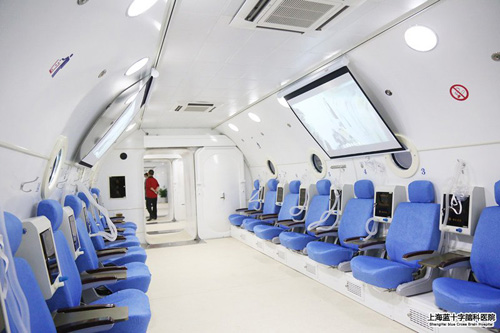 采用了先进的加宽型平移门并消除了氧舱的门槛,使ICU急救病床和担架车及轮椅能够自由进出氧舱,配备了多功能吸氧装具及急救医疗模块,可充分满足各类高压氧适应症患者在氧舱内吸氧治疗和重症患者在氧舱内抢救治疗的需要,最多可容纳40位病人同时治疗!