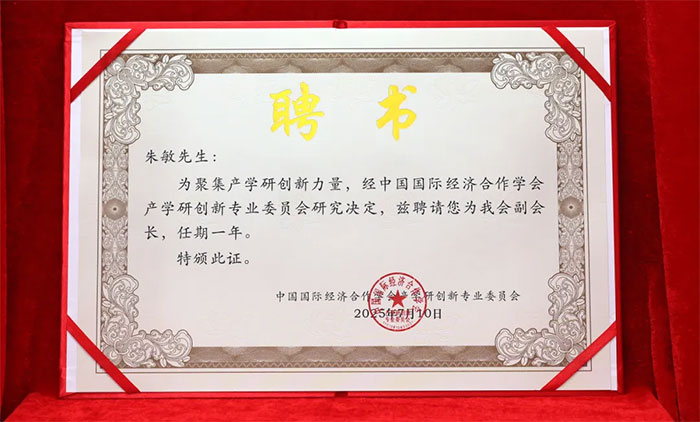 ▲ 中国国际经济合作学会产学研创新专业委员会副会长单位及副会长荣誉牌匾/证书
